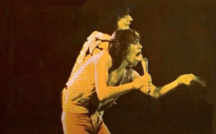 Y de repente, suena un pasodoble y aquí están, LOS ROLLING STONES! Tremendo, “Honky Tonk Woman” para ponerse a punto. Billy Preston está rodeado de teclados – aunque en un par de ocasiones Ian Stewart se sentó al piano – mientras que Ron Wood, ataviado como un charro mejicano, se mueve y sonríe como un chaval que acaba de escaparse de la escuela. Charlie Watts sigue promocionando la moda Dachau, a juzgar por su siniestra cabeza, pero le da con fuerza a los parches, secundado por Ollie Brown cuyos instrumentos de percusión están situados un poco más arriba- El gran Keith Richards parece estar en baja forma, demasiado torpe y feo para adoptar sus poses de guitarrista mortífero, tal vez en las postrimerías de uno de sus famosos ciclos de cuatro días sin dormir. Al extremo, con una indecible expresión de aburrimiento, Bill Wyman con su bajo en posición vertical. Y al frente, el demonio reencarnado: Mick Jagger, que pronto pasa a un histérico “If you can’t rock me” que enlaza con – ¡sorpresa! – unos versos de “Get off of my cloud”, que todavía suena tan enfollonada como en 1966.